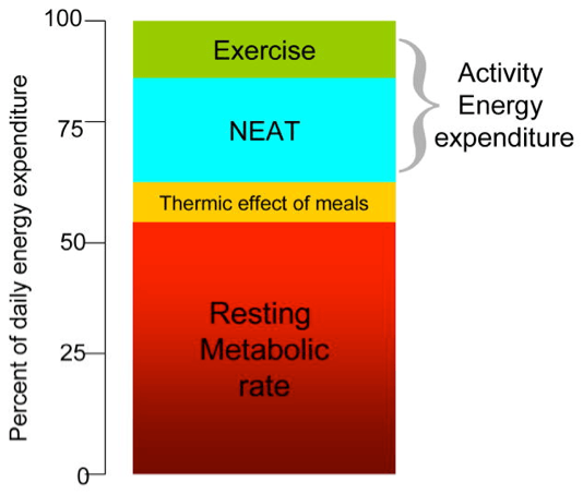 Non-Exercise Activity Thermogenesis (NEAT) – This is our day to day activity, me sitting here typing, you walking from your car to the shops, your leg tapping throughout the day it all counts towards this and if you are someone looking to burn a few more calories this is where you should be focusing your attention. With a whopping 20-25% of your calories burned through this it is the best bang for your buck. Increasing your steps, having something in your hand to play with, standing instead of sitting are all easy wins.