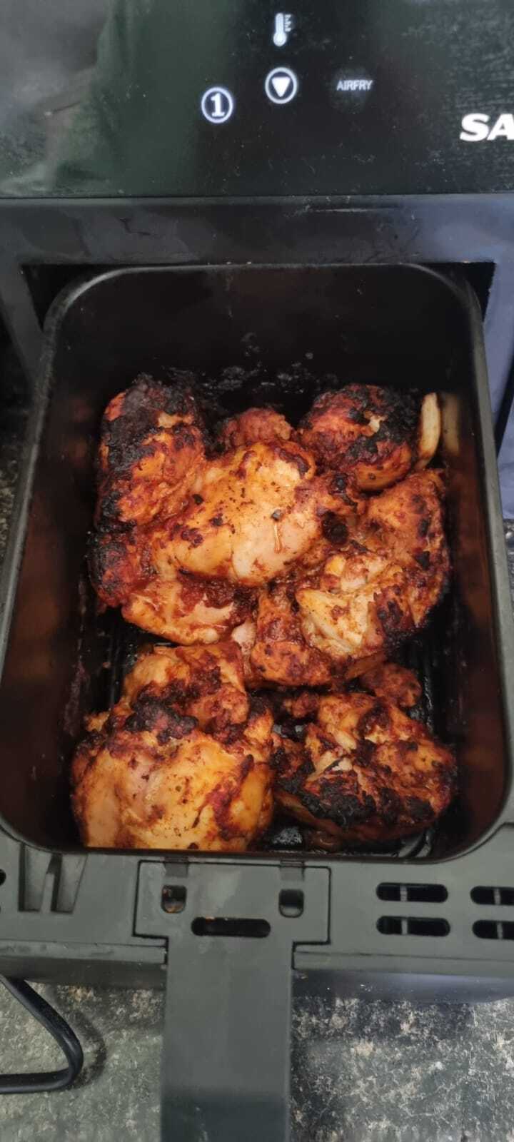 Mix it all together in a bowl, coating the chicken as much as possible and the simply pop in the air fryer for 20-25 minutes giving it a shake every 5 minutes to ensure cooking evenly.